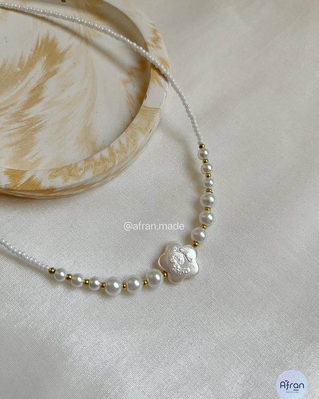 جنس : مروارید سنگی، میوکی سفید ، حدید طلایی ، صدف طرح گل
