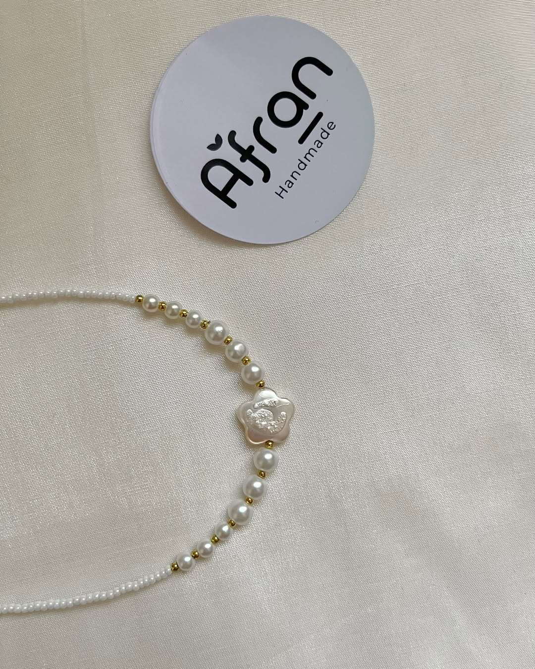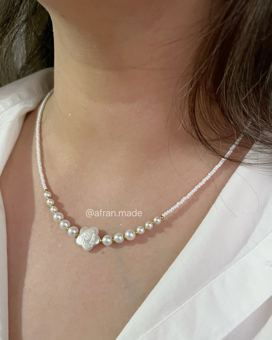 جنس : مروارید سنگی، میوکی سفید ، حدید طلایی ، صدف طرح گل